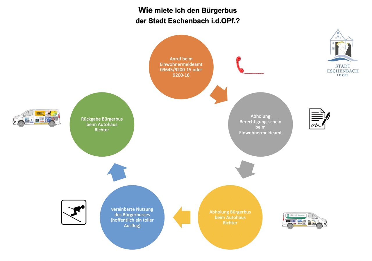 - Interessierte Bürgerinnen und Bürger fragen beim Einwohnermeldeamt der Verwaltungsgemeinschaft Eschenbach i.d.OPf. (09645/9200-15 oder /9200-16) an, ob der gewünschte Nutzungszeitraum für den Bürgerbus noch verfügbar ist.